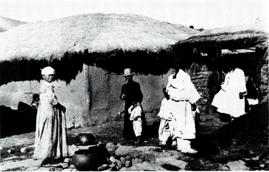 초가집들 사이로 멀리 보이는 기와집이 재령 본당이다(1901. 9월경, 왼쪽). 본당 사제관(1899. 5~ 1901까지 사용)앞에서 신자들과 함께 서 있는 르각 신부.