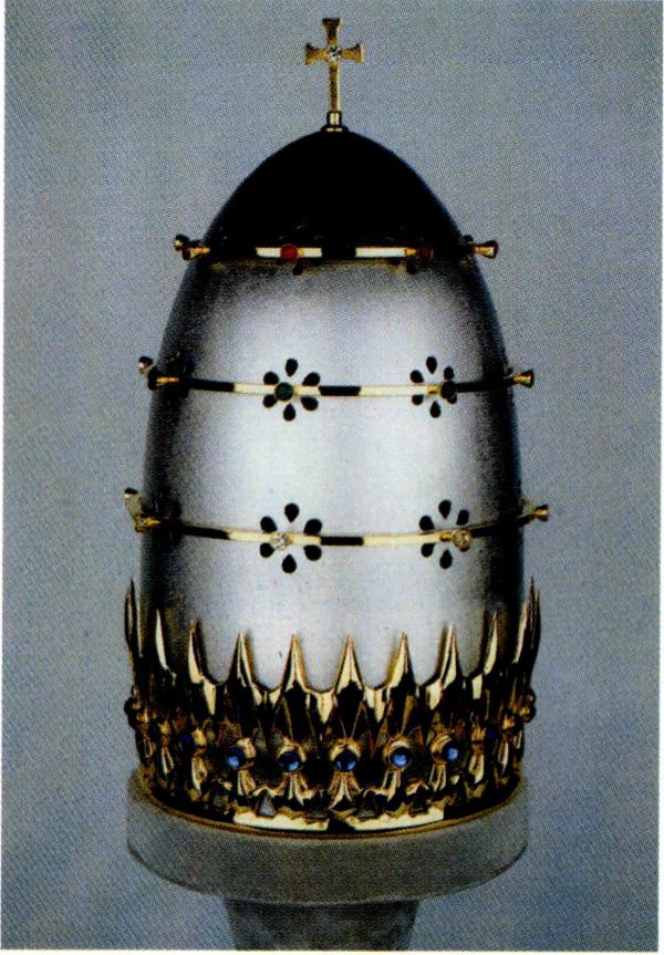 교황 비오 9세의 삼중관(1854, 왼쪽)과 교황 바오로 6세의 삼중관( 1 963, 가운데). 주교관.