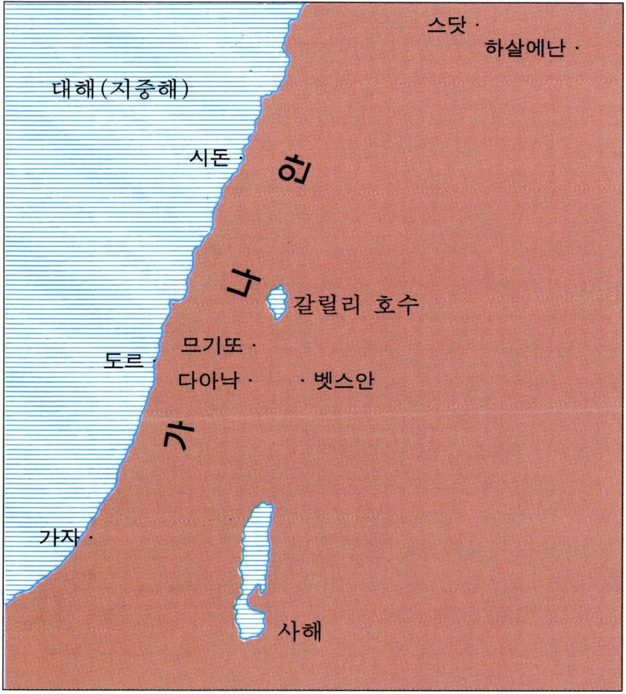 노아의 저주를 받은 함의 아들. 팔레스티나 해안 지대. 그리스어로는 페니키아. 구약성서에서 '가나안' 이라는 말은 간혹 상인(商人)이라는 뜻의 보통 명사로 사용되기 도 하지만, 대개는 인명(13회)이나 지명(80회)을 표시하 는 고유 명사로 사용된다.현재까지 알려진 가장 오래 된 기록으로는 기원전 18세기의 마리 문서에 나오는 '가나 안 사람들' 이라는 표현이다. 그리고 기원전 15세기의 알 라라흐(Alalah)의 이드리미스(Idimis) 자서전에 '가나안 땅' 이라는 표현이 있고, 같은 시기의 이집트 아메노피스 (Amenophis) 2세의 비문은 '640명의 가나안 사람들' 을 포로 명단에 넣고 있다. 기원전 14세기의 아마르나 서신 에도 '가나안' 이라는 표현이 열두 번이나 나타나고, 또 같은 시기의 우가리트(Ugant) 문서에도 '가나안 땅의 사 람들' 이라는 구절이 있다. 이런 증거들은 이스라엘 백성 들이 약속의 가나안 땅에 살기 이전에 이미 가나안 땅과 가나안 백성이 역사적 실재로서 메소포타미아와 이집트에 널리 알려져 있었음을 말해 준다. [어 원] '가나안' 이라는 말의 어원을 어디에서 찾을 것인지에 대해서는 두 견해가 맞서고 있다. 하나는 수메 르어나 아카르어에서 찾는 견해(Alt, Böhl)이고, 다른 하나 는 셈어에서 찾는 견해(Gesenius, Mazar[Maisler] De Vaux)이 다. 전자의 견해에 의하면 '가나안' 은 '땅' 을 뜻하는 수 메르어 Kanaga' 에서 유래하거나 '저지대' 를 뜻하는 아 카드어 'Kingin' 에서 유래한다고 한다. '가나안' 의 어원 을 셈어에서 찾으려는 시도는 대체로 다음의 네 가지 견 해로 나뉜다. ① 느헤미야서 9장 24절에 '가나안 사람 들' 이 '굴복하다' 의 뜻을 가진 같은 어근(kn˚)의 동사와 짝지어 나오는 것과 민수기 13장 29절에 고지대의 아모 리 사람들과 바닷가의 가나안 사람들이 대조되어 나오는 것으로부터 유추해 볼 때 '가나안' 은 '저지대' 를 의미한 다. ② 가나안의 그리스 명칭은 페니키아인데 그 뜻은 자 색 물감이다. 그리스인들은 가나안을 자색 물감의 생산 지로 인식했던 것이다. 한편 누지(Nuzi) 문서에서 Kinahhu' 라는 말은 자주색을 의미한다. 그러므로 '자색 물감 산지' 라는 뜻으로 '가나안' 이라는 지명이 생겨났다 고 추론할 수 있다. ③ '가나안' 이 성서에서 '상인' 이라 는 뜻으로도 사용되는 것을 볼 때, '무역의 땅' 이라는 뜻 으로 지명이 되었다고 추정할 수 있다. 더욱이, 아메노피 스 2세 포로 명단에 나오는 '640명의 가나안 사람들' 도 후리안족의 귀족 무사 계층을 가리키는 '550명의 마리 아나(maryana)' 와 나란히 거론된 것을 보면, 한 사회적 계층의 사람들, 곧 상인 계층의 사람들을 가리키는 말로 이해할 수 있는 것이다(Mazar). ④ '가나안 사람들' 과 '아 모리 사람들' , 그리고 '가나안 말' 과 '아모리 말' 은 각각 같은 것을 가리키는 두 가지 표현에 불과했던 것이며, 따 라서 셈어 '가나안' 은 아카드어 '아무루' (Amurru)와 한 가지로 '서쪽 땅' 을 뜻하는 말이다(Roland de Vaux). [인 명] 창세기 9장 18-27절에서 가나안은 노아의 막 내 아들인 함의 아들로 등장하는데, 노아는 함의 잘못에 대한 벌을 가나안에게 내려서 가나안이 백부 셈의 종이 되도록 저주한다. 이것은 통일 왕국 초기의 기술로서, 셈 족의 우위성을 과시하려는 정치적인 의도를 담고 있다. 다윗과 솔로몬의 통일 왕국은 그 당시 중동에서 가장 강 한 나라였다. 이집트의 파라오가 자신의 딸을 솔로몬의 후궁으로 내줄 수밖에 없었을 만큼 다윗 · 솔로몬 왕국의 세력이 막강했던 것이다. 그러므로 창세기 9장 25절의 가나안에 대한 저주는 셈족의 다윗 왕조가 가나안 사람 들을 완전하게 굴복시켰음을 나타내는 표현이라 하겠다. 한편, 창세기 10장 6절과 15-20절에서 가나안은 함의 넷째 아들로, 시돈과 헷과 팔레스티나 여러 족속의 아버 지로 나타난다. 그러나 실제로 창세기 10장 15-20절의 내용은 이스라엘 왕국 성립 전 가나안 지역의 정치적 상 황을 반영하고 있다. 이집트는 기원전 16세기부터 11세 기까지 신왕조 시대에 중동 세계를 지배하면서 막강한 세력을 떨쳤다. 특히 람세스 2세(기원전1304~1237)는 헷 나라의 하루실리스와 전쟁을 하여 이집트의 국경을 시리 아 남단의 오론테스 강까지 확장시켰다. 그 결과 이집트 의 통치력은 헷 나라 영토를 포함하여 가나안 전지역에 미쳤으므로, 가나안은 이집트 통치령을 일컫는 공식 이 름으로, 곧 정치적 개념으로 변하게 된 것이다. [지 명] 성서에서 가나안 땅의 범위는 전승에 따라 다 르다. 1) 여호수아서 17장 11-13절에 묘사된 가나안 지역은 벳스안, 도르, 다아낙과 므기또 등 해안 지방에 제한되어 있다. 여호수아서 5장 1절에도 가나안은 해안 지역으로 묘사되어 있다. 후에 그리스 사람들은 이 해안 지방을 페 니키아라고 불렀다. 한편, 스바니야서 2장 5절은 이 지 방을 블레셋 지역과 동일한 것으로 간주한다(비교 : 여호 13, 3). 2) 창세기 10장 19절도 가나안 땅을 해안 지역으로 묘사한다. 그러나 그 범위는 여호수아서에서 묘사된 지 역보다 훨씬 넓은 시돈에서부터 가자까지 이른다. 이런 범위는 다윗 왕의 통치력이 시돈까지 미친 데서 연유한 것이다(2사무 24, 6 이하). 마태오 복음 15장 22절에서 시 돈 여인을 가나안 