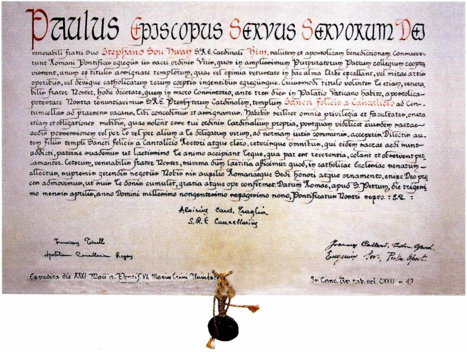 김수환 추기경의 임명을 알리는 교황 요한 바오로 6세의 칙서.