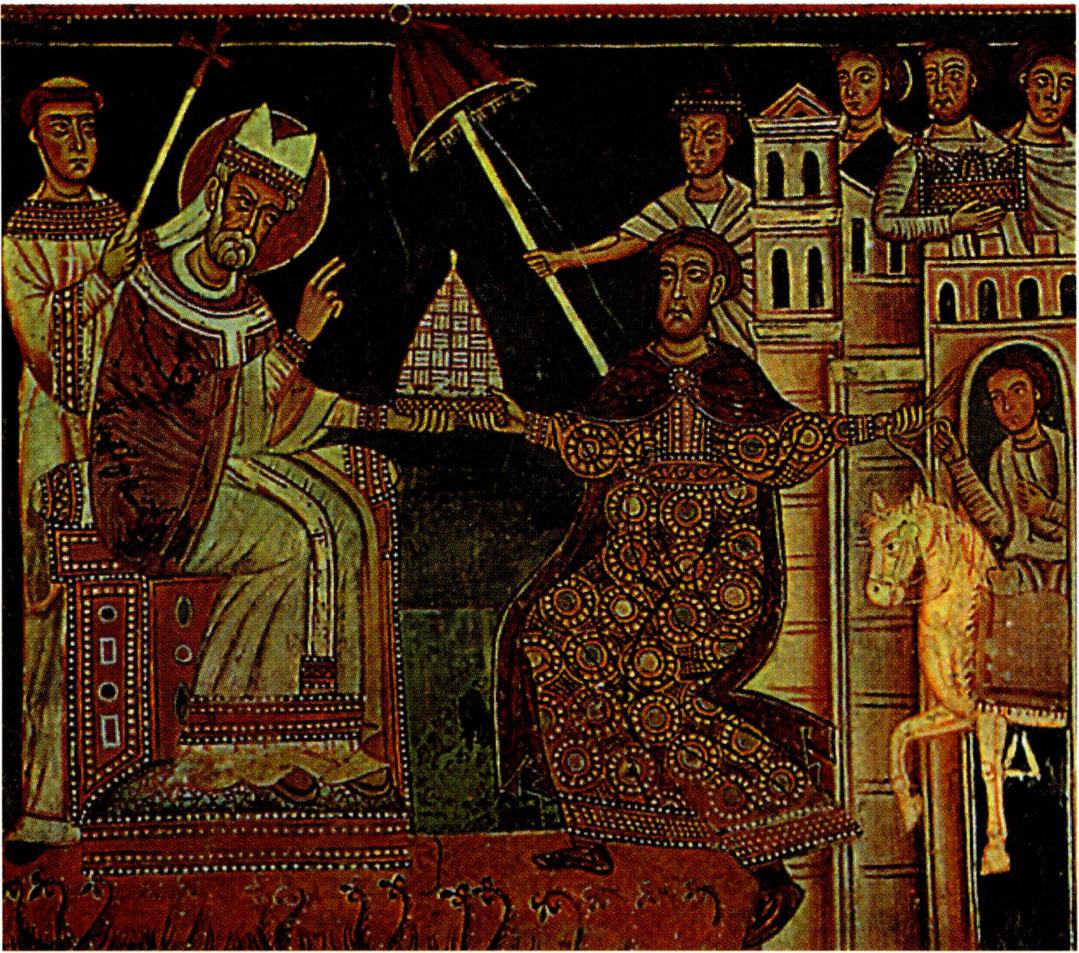 교황 실베스테르 1세에게 황제와 같은 권한을 양도하는 콘스탄틴 대제.