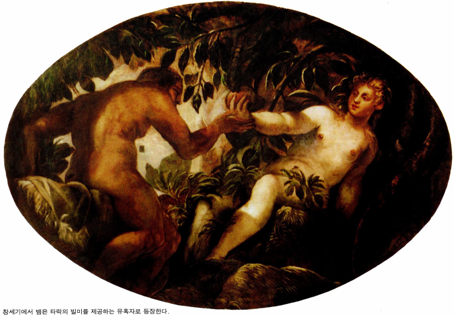 먼저, 죄의 유혹 이야기(창세 3, 1-7)에는 한 쌍의 인간 남녀 곁에 제3자인 뱀이 인간의 유혹자로 등장한다. 야휘스트는 이 유혹자가 하나의 초세계적인 신적 힘이나 사탄 또는 악마(지혜 2, 24 참조)가 아니라, 하느님에 의해 창조된 하나의 피조물 즉 인간 주변 환경으로서의 창조계에 속하는 하나의 피조물이라고 명백히 표현한다(창세 3, 1). 다시 말해 창세기 2-3장의 저자인 야휘스트는 뱀을 피조물의 질서에 속한 현상을 위한 하나의 암호, 즉 이스라엘 주변의 이방 종교가 만들어 놓은 종교적 세계의 암호로 사용한다. 그런데 피조물의 질서에 속한 현상으로서의 이방 종교의 세계는 풍요 다산 및 생명과 지속적 생존을 내세워 인간을 현혹시킨다. 야휘스트는 야훼 종교를 거스르는 이러한 위험스런 이방 종교의 한 상징으로 뱀을 인식하여, 뱀에게 풍요 다산과 불멸하는 생명 을 미끼로 사람들을 죄로 유인하는 유혹자의 역할을 배정한다. 사실 고대 가나안인들은 풍요 다산을 가져오는 불멸의 신들과 뱀을 연관지어 생각하였다. 즉 뱀은 풍요와 다산의 표지이자 생명의 상징일 뿐만 아니라, 의술에 종사하는 사람들의 신들을 상징하는 하나의 형상이었다. 그러나 창세기 3장 1절에서는 뱀을 탈신화화하여 신적 기운을 지니지 않은 한낱 피조물로 묘사할 뿐 아니라, 심지어 3장 14절에서는 그 피조물을 땅바닥을 기며 먼지를 먹는 파충류로 강등시킨다. 그러므로 야휘스트에게 있어서 뱀은 탈신화화된 존재로서, 인간의 주변 환경에 속하는 하나의 피조물일 뿐이다.