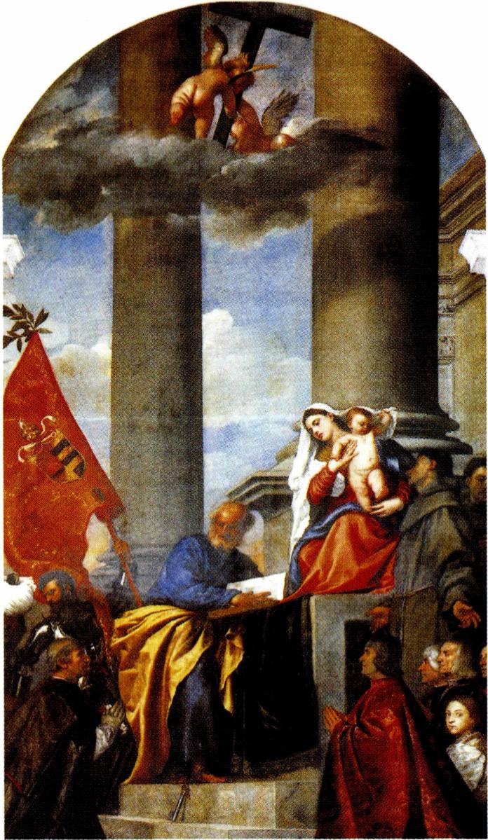 16세기의 이탈리아 베네치아파 화가. [생애와 작품] 티치아노는 현재 오스트리아와의 국경 지역인 이탈리아 베네치아의 북부 피에베 디 카도레(Pieve di Cadore)라는 알프스의 작은 마을에서 태어났다. 그 의 부모인 그레고리오 디 콘테 데이 베철리(Gregorio di Conte dei Vecelli)와 루치아(Lucia)는 겸손한 재력가로 존 경받는 인물이었다. 초기- 벨리니와 조르조네의 영향 : 1498년경 티치아 노와 그의 형 프란체스코(Famoceco)는 베네치아로 가서 모자이크 화가인 추카토(S. Zuccato)의 공방에서 교육을 받기 시작하였다. 그러나 티치아노는 곧 추카토를 떠나 젠틸레 벨리니(Gentle Bellini, 1429?~1507)와 조반니 벨 리니(Giovani Bellini, 1430?~1516)형제의 작업장에서 그 림 공부를 시작하였다. 현존하는 그의 작품 중 가장 오래 된 것으로 여겨지는 <교황 알렉산데르 6세가 자코포 페 사로를 베드로 성인에게 소개함>(1502~1512)은 조반니 벨리니의 영향을 받은 작품으로 알려져 있다. 1507년부터 티치아노는 조르조네(Giogionee)라고도 불린 조르조 다 카스텔프랑코(Giorgio da Castelfranco, 1477?~1510)의 작업장에서 그가 죽은 1510년까지 3년 간 조수로 일하였다. 그와 같은 뛰어난 화가와 함께한 시 간은 상당히 오랫동안 젊은 티치아노에게 영향을 미쳤 다. 그래서 티치아노가 그렸음에도 불구하고 조르조의 것으로 여겨지거나 혹은 그 반대의 경우인 작품들도 있 다. 이렇게 작가가 불분명한 작품 중 하나가 <전원의 합 주>(1510~1511)로, 어떤 자료에서는 여전히 이 작품이 조르조의 작품으로 기록되어 있다. 티치아노의 작품 중 조르조의 영향이 묻어나는 것으로는 <아도니스의 탄생> (1505~1510), <폴리도로스의 전설〉(1505~1510), <성 마 르코가 성인들의 존경을 받음>(1510?), <합주>(1510?), <놀리 메 탕게레>(1511~1512), <집시 마돈나>(1512?)와 <성스러운 사랑과 세속적인 사랑〉(1514) 등과 같은 대작 도 있다. 1510년 티치아노는 파도바의 안토니오(Antonius Patavii, 1195~1231)의 세 가지 기적을 주제로 한 프레스코화 를 제작해 달라는 주문을 시작으로 독립적으로 주문을 받기 시작하였으며, 베네치아의 화가로 자리잡게 되었 다. 1513년에 그는 자신의 작업장을 열고 두 명의 조수 를 고용하게 되는데, 그중 한 사람은 조반니 벨리니의 작 업장에서 일하던 사람이었다. 1516년 티치아노는 프란 치스코 수도회의 성당인 베 네치아의 산타 마리아 글로리오사 데이 프라리(Santa Maria Gloriosa dei Frari)의 주 제단을 위한 새로운 작품을 주문받았다. 그래서 제작된 작품이 <성모 승천>(1516~ 1518)인데, 이 제단화는 베네 치아 전성기 르네상스의 지표가 되었을 뿐만 아니라 티 치아노를 베네치아 최고의 화가로 만들어 주었다. 또한 벨리니 가문의 오랜 후원자로 북부 이탈리아를 통치하 는 페라라 공작 알폰소 1세 (1476~1534)의 주목을 받게 되어, 신화를 주제로 한 <비 너스 예찬>(1518), <바쿠스 와 아리아드네)(1520-1522) <아드리아 사람들의 주신제> (1523~1525)라는 세 점의 작 품을 제작하였다. 1519년 티치아노는 또 다 른 기념비적 작품인 <페사로 제단화>(1519~1526) 및 <어 린 그리스도와 성 프란치스코와 알비세 그리고 봉헌자 알비세 고치(Alvise Gozzi)와 함께 있는 영광의 성모> (1520)를 제작하는데, 이 작품은 미래의 기준이 된다. 이 시기의 또 다른 대작으로 <순교자 베드로의 죽음>이 있 는데, 이 작품은 소실되었다.1523년에 티치아노는 만 토바 공작인 곤차가 가문(Gonzagadynasty)의 페데리코 2 세(Federico Ⅱ, 1500~1540)를 만나 <페데리코 2세의 초상 화>(1523~1529) 및 <성 가타리나와 토끼와 함께 있는 성 모자(聖母子)>(1530) 같은 종교화를 제작하였으며, 그의 소개로 신성 로마 제국의 황제 카를 5세(1519~1556)를 만났다. 중기 초상화가로서의 명성 : 1520~1540년대에 티 치아노는 당대 최고의 초상화가가 되었다. 현존하는 작품 중 손꼽히는 것으로는 <몰타의 기사>(1510~1515) <모자 와 장갑을 낀 젊은 남자>(1512?~1515), <장갑을 낀 남자> (1520?~152), <토마소(Tomasso)의 초상〉(1526?), <바스 토의 후작, 알폰소 다발로스>(Alfonso d'Avalos, Marques del Vasto, 1533), <이폴리토 데 메디치(Ippolyto de'Medici) 의 초상>(1533), <라 벨라>(La Bella, 1536), <우르비노의 공작, 프란체스코 마리아 델라 로베레(Francesco Maria della Rovere)의 초상>(15362~1538), <젊은 영국 남자> (1540?~1545), <추기경 피에트로 빔보(Pietro Bembo)의 초상화>(1540?), <음악가의 초상>(1515? 또는 1544?~ 1546), <소녀의 초상>(1545?) 등이 있다. 1533년 티치아노는 카를 5세의 궁정 화가로 임명되 고, 팔라틴 백작위를 받았다. 그리고 카를 5세의 초상화 를 여러 점 그렸는데, 황제는 티치아노가 떨어뜨린 붓을 집어 줄 정도로 그에게 경의를 표하였다고 한다. <카를 5세의 초상>(1533), <밀베르크에서의 황제 카를 5세의 초상〉(1548), 〈앉아 있는 황제 카를 5세의 초상>(1548) 등의 작품이 있으며, 황제의 가족 초상화도 제작하였다. 황후를 그린 <포르투갈의 이사벨〉(1548)과, 카를 5세의 아들이자 후에 스페인의 왕이 되는 펠리페 2세(1556~ 1598)를 그린 <갑옷을 입은 펠리페 2세의 초상>(1550?~ 1551), <펠리페 2세의 초상>(1554?) 등이다. 1538년에 티치아노는 또 다른 걸작을 제작하였는데 이것이 바로 <우르비노(Urtino)의 비너스〉이다. 이 작품 은 그가 그