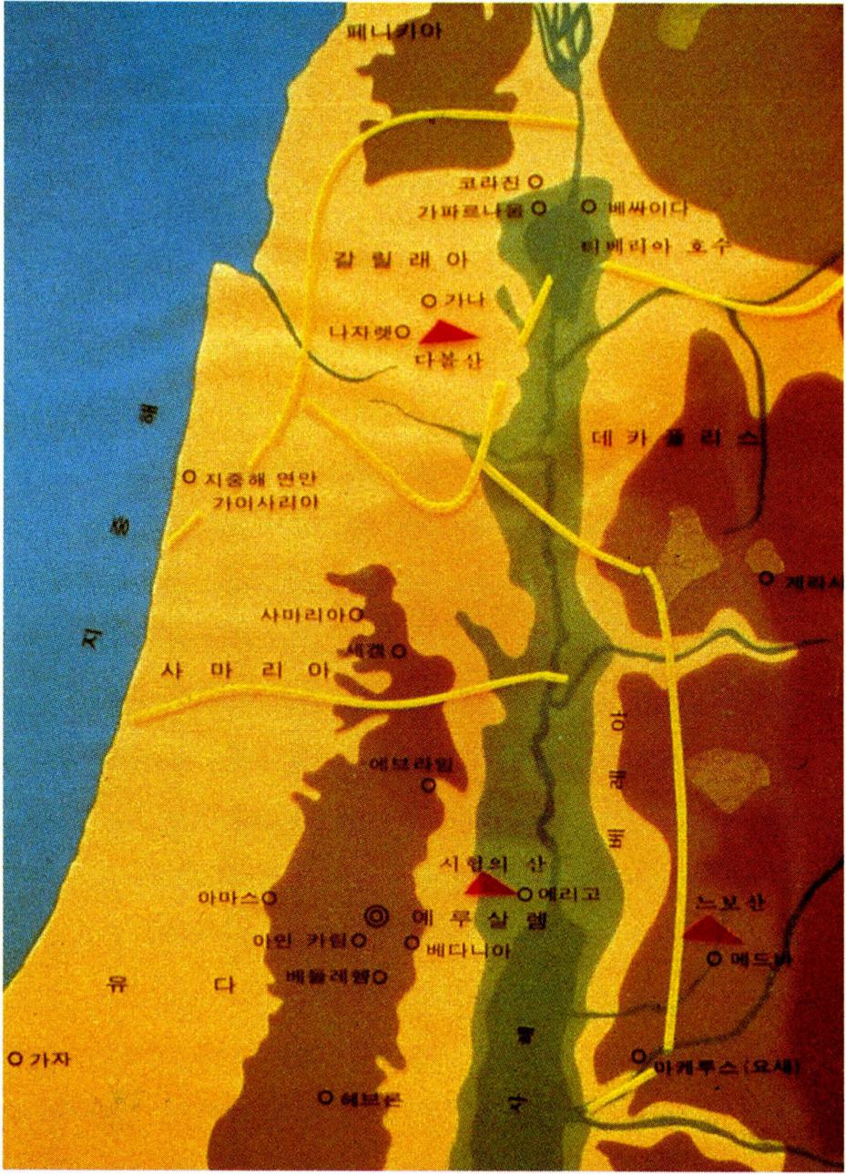북쪽 단에서 남쪽 브엘-세바까지(판관 20, 1 ; 1사무 3, 20) 남북으로 242km, 동서로는 북부의 경우 갈릴래아 호수에서 지중해까지 45km, 남부는 사해에서 지중해까 지 87km에 걸쳐 펼쳐진 낮은 구릉과 평원으로 이루어진 지역. 하느님이 아브라함에게 주겠다고 약속한 땅(창세 12, 7 ; 13, 15 : 15, 18 ; 26, 3-4 ; 28, 13)이기에 '약속의 땅' 이라고도 하며, '가나안 지역' 이나 '이스라엘 땅' 이 라고도 한다. [명 칭] '팔레스티나' 라는 단어는 '불레셋' 을 의미하는 히브리어 '펠레쉐트' (פְּלֶשֶׁת)에서 유래하였다. 그리스의 역사가인 혜로도토스(Herodotos, 기원전 484?~ 430/420?) 는 지중해 동남부 연안을, 과거 이 지역에 살았던 불레셋 족(פְּלֶשֶׁת)의 시리아라 하여 '팔라이스티네의 시리아' (Συρία της Παλαιστίνης)라고 기록하였다(《역사》 1, 105). 본래 불레셋족의 땅은 팔레스티나의 남서 해안 지역에 국 한되었으나, 시리아 남부 이남 지역을 가리킨 이 이름이 형용사에서 명사로 바뀌어 그리스-로마 세계에 널리 퍼 졌다(플리니우스, <박물지> 5, 12). 바르 코크바(Bar Kokhba, ?~135)가 로마에 대항하여 일으킨 제2차 유대 독립 전쟁 (132~135)이 실패한 후, 로마의 하드리아누스 황제(117 ~138)는 유대 지역을 포함한 시리아 남부를 '시리아-팔 레스티나' 로 공식 명명하였다. 그리고 4세기에는 세 지역으로 나뉘어 제1, 제2, 제3 '팔레스티나' 로 쓰였다. 지리적 경계가 정확히 일치하지 않지만, 고대의 근동과 이집트에서는 이 지역을 '가나안' , '아모리족의 땅' , '후리족의 땅' 으로, 고대 이스라엘 사람들은 '이스라엘 땅' (1사무 13, 19) 또는 '거룩한 땅' (즈가 2, 16)으로, 중 세 십자군 왕국에서는 '팔레스티나' 또는 '성지' 로 불렀 다. 1922년 이 지역을 위임 통치한 영국은 요르단 강 서 편을 가리키는 공식 명칭으로 중세 이후 잊혀졌던 팔레 스티나란 용어를 되살렸다. 팔레스티나의 지리적 경계를 설정하기는 어렵지만, 일반적으로 티레 북쪽의 리타니 강과 헤르몬 산 이남, 시리아 사막의 동편, 네겝 사막의 북쪽에 위치한 지역을 가리킨다. 네겝 남부의 카데스 바 르네아까지 포함하는 견해도 있지만, 대개 사람이 지속 적으로 거주하였던 지역을 기준으로 북위 31˚ 15' 에서 33˚ 20' 으로 설정할 수 있다. 면적은 대략 26,000k㎡이 며, 요르단 강 서편과 동편의 면적비는 6:4이다. [지 질] 팔레스티나는 중생대 쥐라기 후기부터 진행된 지각 작용으로 생겨났다. 판게아(Pangaea) 초대륙에서 곤드와나 대륙(Gondwanaland)이, 다시 이 대륙에서 인도 가 떨어져 나가 로라시아(Laurasia) 대륙에 충돌하면서 히말라야 산맥을 비롯하여 토로스, 자그로스 산맥 등이 생겨났다. 이런 가운데 두 대륙 사이에 있던 테티스 해의 동쪽 해안은 현재의 사해 지구대(地溝帶)까지 축소되었 다. 백악기 후기에 습곡(褶曲) 작용으로 테티스 해가 솟 아올라 서부 산악 지대를 이루는 한편, 요르단 강 동편의 아라비아 반도는 여러 조각으로 갈라졌다. 그래서 그 사 이에 급격한 단층 운동으로 지각이 함몰하여 사해 지구 대가 형성되었다. 그리하여 팔레스티나의 서편 암석들에는 테티스 해의 퇴적물로 형성된 석회암층이 여러 층에 걸쳐 전반적으로 깔려 있다. 물을 쉽게 침투시키는 석회암의 특성상 팔레 스티나에서는 물을 구하기 힘들며, 석회 동굴이 많다. 그 래도 석회암이 풍화된 지중해 적색토(terra rosa)는 매우 비옥한 토양이라 농경에 큰 도움을 준다. 그 밖에 아라비 아 반도와 같은 지질에 속한 에돔과 모압 일대에는 누비 아 사암층이, 바산과 갈릴래아 동부에는 화산의 분출로 형성된 현무암이, 유대 광야와 네겝 일대에는 점토질 석 회암인 이회암이 넓게 분포되어 있다. 팔레스티나는 지 각이 불안정하여 여러 형태의 자연 재앙이 발생하였다. 아카바 만 남동쪽에는 화산이 존재하였으며(출애 19, 18), 지진도 드물지 않았다(1사무 14, 15 아모 1, 1). [자연 지리] 팔레스티나는 매우 좁은 땅이지만, 서쪽 에서 동쪽으로 가면서 서로 다른 네 가지 형태의 지형이 남북으로 길게 뻗어 있다. 즉 해안 지대, 서부 산악 지 대, 협곡 지대인 사해 지구대, 동부 산악(고원) 지대 등이 다(민수 13, 29). 해안 지대 : 지중해 해안을 따라 현재의 레바논 국경 선부터 가자(Gaza)까지 약 200km에 이른다. 아코(Akko) 북쪽에는 해안선의 굴곡이 심해 빼어난 천연 항구가 많은 반면, 가르멜 산 남쪽으로는 해안선이 완만하여 요 빠(Joppa, 현 Tel Aviv-Yafo) 같은 몇몇 항구만 인공적으로 조성되었다. 그래서 바다 진출이 어려운 대신 해안 내륙 에 발달한 평야에서 농경과 목축이 활발하였다. 폭은 아코 쪽이 8km, 남부 가자 쪽이 32km 정도인데, 북쪽에서 부터 아코 평야(연 강우량 600mm), 샤론 평야, 야르콘 강 남쪽의 불레셋 평야(연 강우량 300mm) 등 충적 평야가 차 례로 이어진다. 이곳에는 예로부터 가장 중요한 국제 교 통로인 '해변길' (Via Maris)이 경유하여 일찍부터 인구 가 밀집하였다. 가르멜 산 동쪽의 이즈르엘 평야 (365k㎡)는 갈릴래아와 사마리아를 가르면서 해안 지대 와 사해 지구대를 동서로 잇는 유일한 교통로이다(최대 길이 50km, 폭 20km). 고대로부터 땅이 비옥하고 기손 강 (37km)이 흘러 최대의 곡창 지대인데