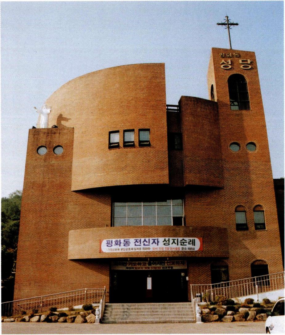 ① 대구대교구 소속 본당. 경북 김천시 평화동 406-1 소재. 1958년 10월 25일 김천 황금동 본당에서 분리 ·승격되었으며, 주보는 그리스도 왕. 관할 구역은 김천시 평화동, 부곡동, 성내동 남산 일부 지역과 대항면, 봉산면 전역.〔교 세〕1958년 1,300명, 1965년 2,100명,1969년 2,357명, 1975년 2,878명, 1980년 2,441명, 1985년 2,947명, 1990년 4,104명, 1995년 5,842명,2000년 6,658명, 2004년 3,300명.〔역대 신부〕초대담(F. Damm, 卓世榮) 파비아노(1958. 10~1964. 7), 2대 김영근(金永根) 베다(1964. 7~1968. 8), 3대 퓌테르(M.Fuetterer, 곽미걸) 미카엘(1968. 8~1981. 2), 4대 노규채(盧奎彩) 아우구스티노(1981. 2~1984. 1), 5대 김용길(金 容吉) 바오로(1984. 1~1987. 1), 6대 장태식(蔣泰植) 리노 (1987. 1~1989. 6), 7대 이재명(李在命) 바오로(1989. 6~ 1991. 3), 8대 정성해(鄭成海) 베드로(1991.3~1996. 8), 9 대 김충(金忠) 프란치스코 사베리오(1996. 8~1999. 11), 10대 여창환(呂昌煥) 라우렌시오(1999. 11~현재). 1950년대 김천 지역 천주교 신앙의 중심지였던 김천 (현 황금동) 본당은 관할 지역이 넓었을 뿐만 아니라 교세 도 빠르게 증가하여 사목 활동을 전개하는 데 적지 않은 어려움을 겪었다. 황금동 본당 7대 주임 담 신부는 이러 한 점을 고려하여 관할 구역에 새로운 성당 건립을 계획 하였고, 모국 독일의 신자들과 본당 신자들의 도움을 받 아 평화동 406-1번지를 성당 부지로 매입하였다. 그리 고 1958년 3월 독일인 성직자이자 건축가인 슈미트(A. Schmid, 安) 신부의 설계를 바탕으로 성당 건축 공사를 시작하여 10월에 완공한 후 비테를리(T. Bitterli, 李聖道) 몬시놀의 집전하에 봉헌식을 거행함으로써 평화동 본당 이 설립되었고, 김천 본당은 행정 구역 명칭을 따라 '김 천 황금동 본당' 으로 이름을 바꿨다.