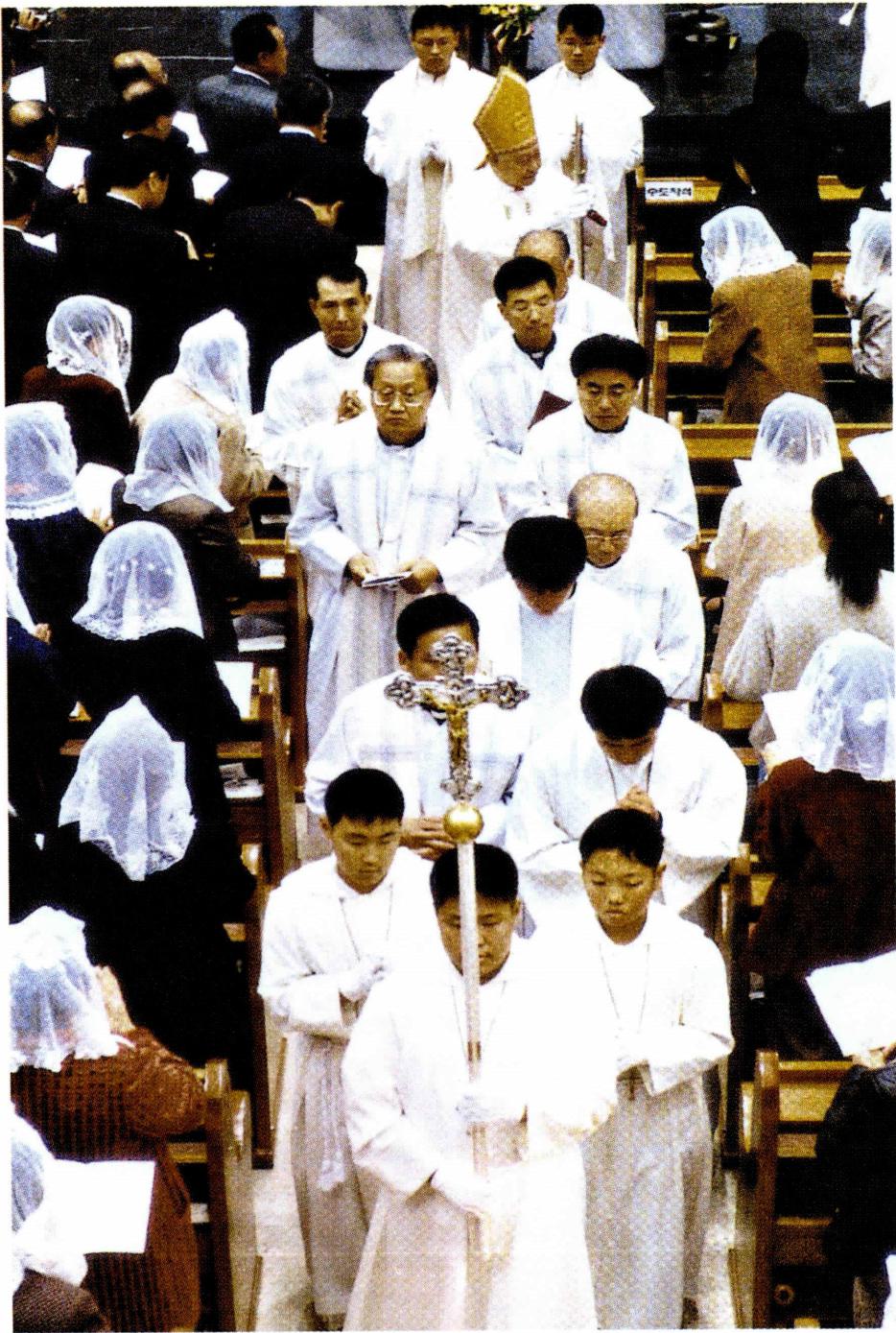 퇴장 직전 제대에 깊은 절을 하는 사제들.