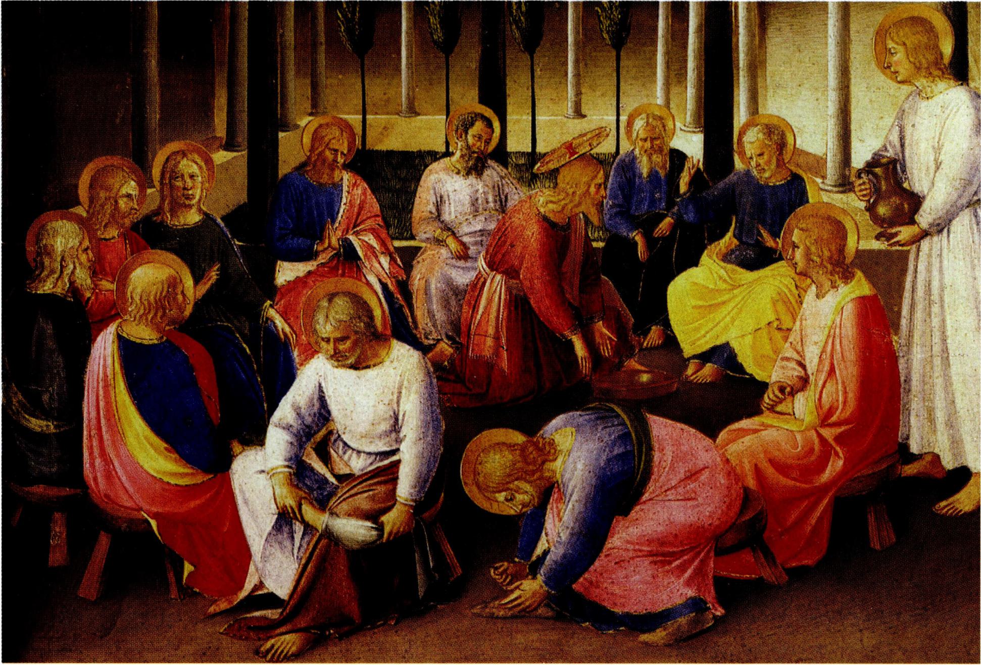요한 복음서는 같은 사실을 예수가 수난 전날 저녁에 제자들의 발을 씻어 준 것으로 드러낸다(요한 13, 1-20). 발을 씻어 주는 것은 종이나 노예가 상전에게 하는 일로, 유대인 종에게는 요구할 수도 없을 정도로 천한 일이었다. 스승과 제자의 관계 역시 주인과 종의 관계와 동등하다. 스승이며 주님이신 분이 제자이며 종인 사람들에게 노예가 하는 일을 해 주었다. 이로써 공관 복음서가 언급하였던 하느님을 섬기는 종들, 하느님의 종 그 자체인 그리스도를 따르는 이들이 어떠해야 하는지 몸소 보여 준것이다. "주요 또 선생인 내가 여러분의 발을 씻었다면 여러분도 마땅히 서로 발을 씻어 주어야 합니다. 내가 여러분에게 본을 보여 준 것은 내가 여러분에게 행한 대로 여러분도 그렇게 행하도록 하려는 것입니다" (요한 13, 14-15) .