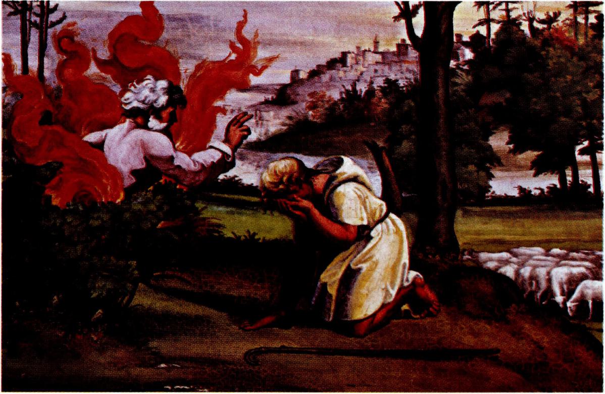 불 붙은 떨기나무에서 하느님의 현존을 체험한 모세.