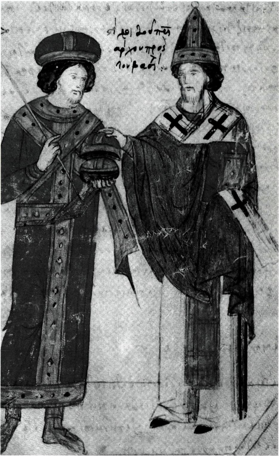 교황 레오 9세(오른쪽)와 콘스탄티노플의 총대주교 체룰라리우스. 둘 사이에서 훔베르트는 동방 이교 논쟁의 중심 역할을 하였다.