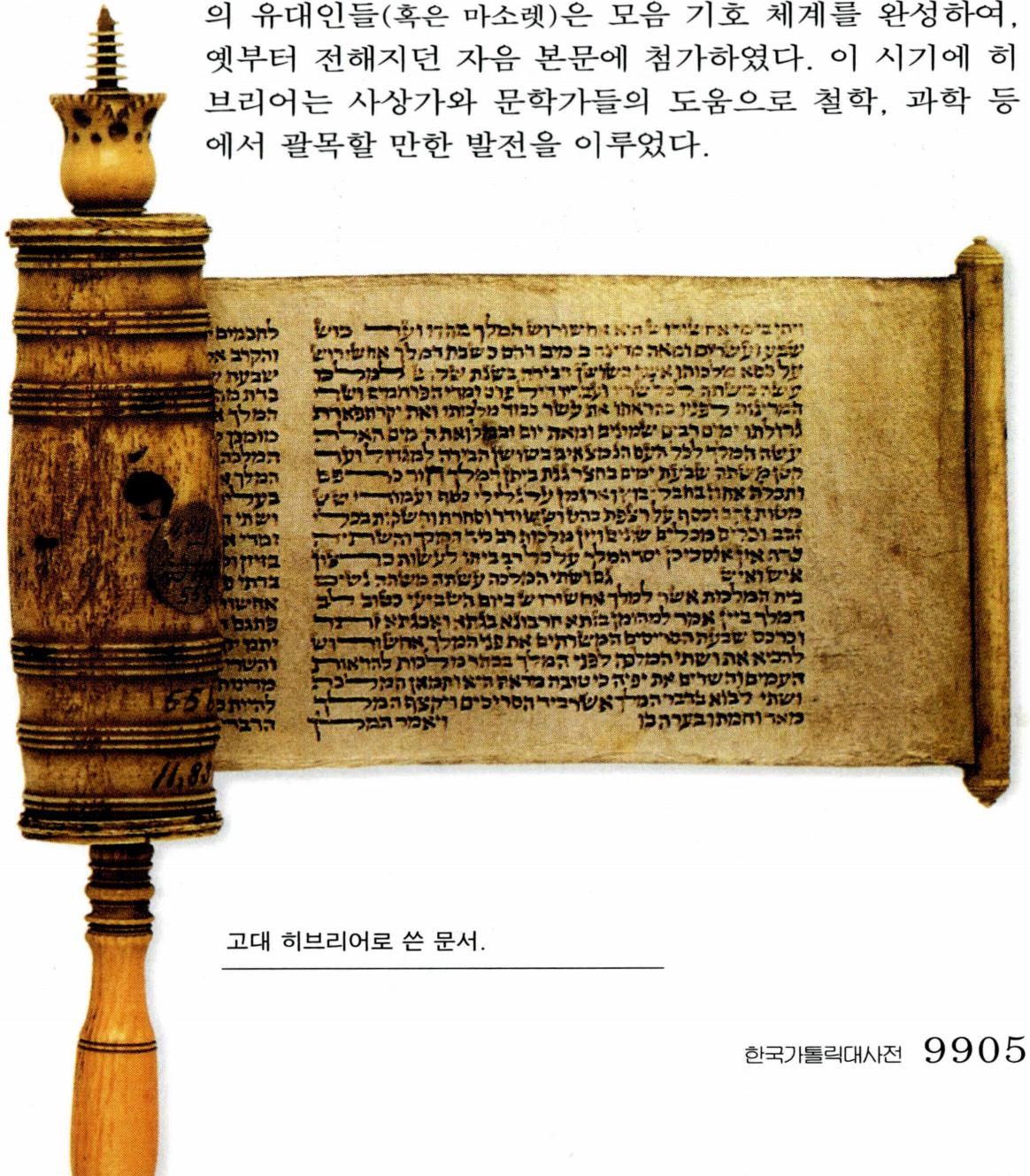 〔문 자〕 기원전 10세기에 페니키아 문자에서 기원한 히브리어 문자는 앞의 도표와 같이 총 23자로 구성되며, 이 문자들은 자음에 해당된다. (→ 구약성서 ; 셈족 ; 언어 ; 유대교 ; 이스라엘 ; 히브리인)