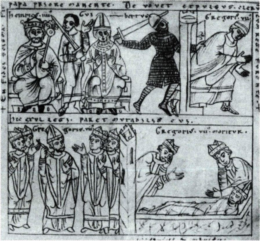 1075년 12월에 그레고리오 7세는 황제의 이러한 행 동에 대하여 엄중한 경고 편지를 보냈지만 하인리히 4세 는 국내의 주교들을 소집하여 보름스 회의를 개최(1076. 1), 반 교황적인 주교들과 함께 신성 로마 제국 황제의 전통적 직권에 의거하여 그레고리오 7세의 폐위를 선언 하였다. 이에 대응하여 교황도 로마에서 회의를 열어 하 인리히 4세를 파면, 파문하고 제국의 봉신들에게 황제에 대한 충성 선언과 복종 의무를 해제하였고 황제를 지지 한 주교들에게는 파문과 성직을 금지하는 처벌을 내렸 다. 신성 로마 제국 제후들도 1076년 10월 트리블에서 모임을 갖고 황제에게 1년 이내에 교황으로부터 파문 취 소를 받지 못하면 새 황제를 선출하겠다는 최후 통첩을 보냈다. 마침내 사태가 자신에게 불리하다고 판단한 하 인리히 4세는 북상(北上) 중인 교황보다 앞서 이탈리아 로 출발하여 카노사에 도착, 3일 동안(1077. 1. 26~28) 혹 한 속에서 무모(無帽), 맨발, 수도복의 복장으로 파문 해 제를 간청하였다. 이 사건으로 그레고리오 7세는 성직 서임권(聖職敍任權) 논쟁에서 승리하였고 황제권에는 회복할 수 없는 치명타를 입혔으며 서구 세계의 주도권 이 황제에게서 교황으로 넘어가, 세계의 주인으로서의 지위를 실현한 것처럼 생각되었다. 그러나 1083년 하인 리히 4세는 국내의 반대 세력을 무찌르고 다시 이탈리아 로 들어가 로마를 점령하였다. 이 사건에 앞서 1077년 신성 로마 제국의 제후들은 교황의 승인을 받지 않고 스 바비아의 루돌프를 국왕으로 선출함으로서 3년(1077 ~1080) 동안의 내란이 발생하였다. 처음에는 중립적 태 도를 보인 그레고리오 7세는 루돌프의 승리를 계기로 1080년 3월에 회의를 소집하여 카노사의 약속을 지키지 않는 황제를 두번째로 폐위와 함께 파문에 처하고 루돌 프를 국왕으로 승인하였다. 그러자 하인리히와 제국의 일부 주교들은 6월 25일 브릭센에 모여 그레고리오 7세 를 폐위하고 라벤나의 대주교 구이베르트를 대립 교황 글레멘스(1080-1084)로 즉위시켰다.