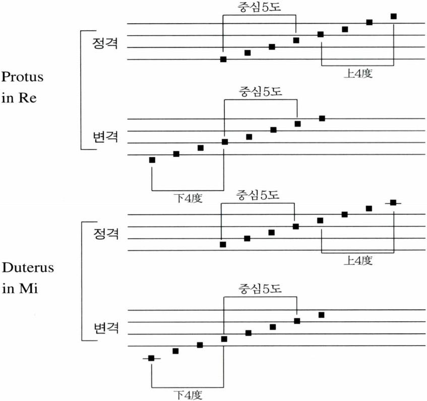 〔리 듬〕 현대 음악이 세분할 수 있는 다양한 리듬의 형 태를 가지고 있는 데 반해 그레고리오 성가의 리듬은 나누어질 수 없는 기본 박자로 이루어진다(예 : ■ ◆ ■ ··· 그레고리오 성가에서 박자는 '익투스'(ictus, 打點)라 표현하며 이것이 리듬 을 나타낸다. 또한 2박, 3박 계열의 리 듬이 혼합되어 끊임없이 교체하면서 흐르는 선율을 구성한다는 의미에서 자유로운 리듬이라 한다. 이 리듬의 본 질은 '도약(arsis)과 '쉼'(thesis) - 시작 에서 정지까지의 과정 - 으로 구성되며 단순 리듬과 복합 리듬의 두 종류가 있다. 단순 리듬은 한 개의 도약과 쉼 으로 이루어지나, 복합 리듬은 단순 리 듬이 복합된 형태로 더욱 많은 리듬의 요소들로 구성되어 있다. 또한 라틴어와 밀접한 관계가 있는 리듬은 라틴어의 음절에 따라 형성되는 경우가 많다. 〔선 법〕 그레고리오 성가의 선율들은 종지음(fnalis), 낭송음(tenor), 음역 (ambitus) 그리고 전형적 음정과 일정 한 형식에 따라 8선법으로 정리된다.8선법은 종지음의 레, 미, 파, 솔 음계 에 따라 네 종류로 나뉘며, 네 종류의 각 음계는 각각 정격 선법(modus authenticus ; 5성 + 4성)과 변격 선법 (modusplagalis ; 4성 + 5성)을 갖고 있 다. 8개의 교회 선법 양식을 도표로 소 개하면 다음과 같다. 교회 전례에서는 계속 사용되었으나 음악사적으로 쇠퇴기를 거친 그레고리오 성가는 이 성가에서 발전해 간 다성 음악과 특히 세속 음악의 영향으로 그레고리오 성가의 개혁의 필요성을 느 껴 16세기 트리엔트 공의회에서 시도한 메디치 판 (Medicean ed.)은 학문적 기반을 두지 않은 후기 르네상 스의 심미학쪽으로 기울어진 바 19세기 말 프랑스의 솔 렘 수도원에서 새로이 선율의 정확성, 리듬에 대한 연구 등으로 바티칸 판(Vatican ed.)을 만들어 현재 사용하고 있다. ※ 참고문헌 차인현, 《그레고리오 성가》, 가톨릭대학 출판부, 1991/ 한국 순교 복자 수도회,(그레고리오성가이론) 1981/ 김건정, 《교회 전례 음악》, 가톨릭 출판사, 1987/ 《가톨릭 사전》 R.G. Weakland, 《NCE》 61 F. Tack, Gregorian Chant, Cologne, 1960/ L. Agustoni, Gregorianischer Choral, Freiburg, 1963/ G.M. Sünol, Introduction a la Paléographie Musicale Grégorieme, Tournai, 1935/ S. Waesberghe, Gregorian Chant, London, 1949. [朴大宗]