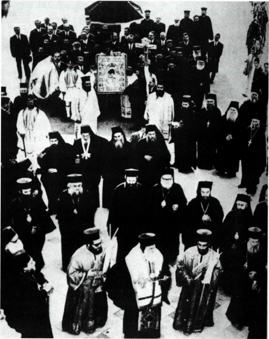 20세기 그리스 성인인 넥타리오스 케팔라스의 이콘 경배.