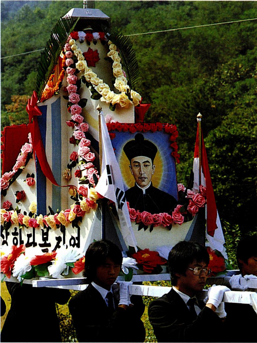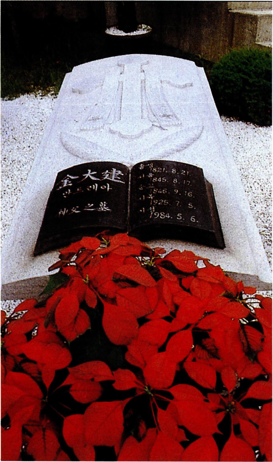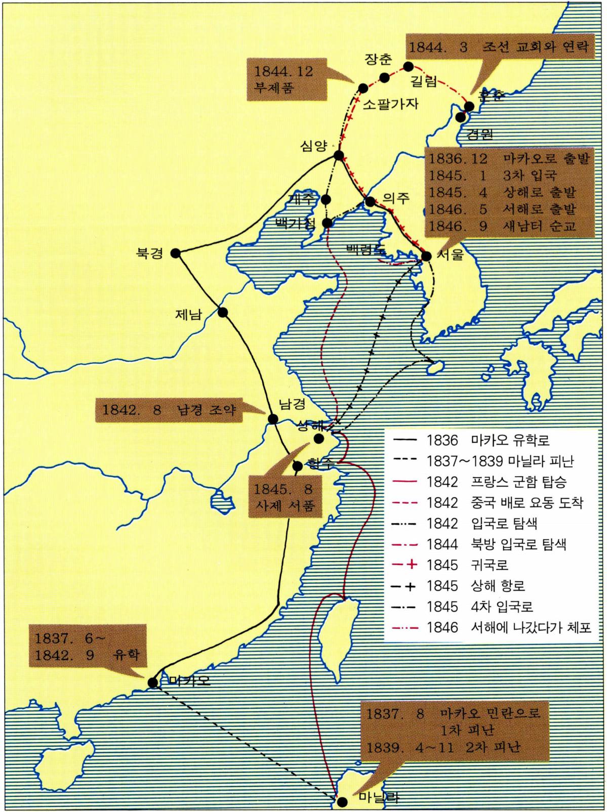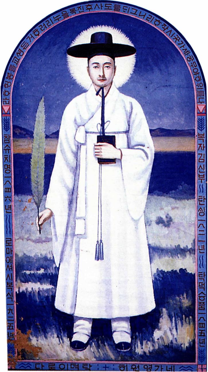 최초의 한국인 신부요 한국 성직자들의 수호자. 천주 교 103위 성인 가운데 한 사람. 세례명은 안드레아. 아 명은 재복(再福). 보명은 지식(芝植). 관명은 대건(大 建). 본관은 김해. 〔가 문〕 김대건은 1821년(순조 21) 8월 21일 충청도 솔뫼(현 충남 당진군 우강면 송산리)에서 김제준(濟俊, 보명 은 濟麟, 字는 信明, 이냐시오)과 장흥(長興) 고씨 우르 술라의 장남으로 태어났다. 그의 집안은 몰락 양반 가문 으로, 천주교와 관계를 맺은 것은 김대건의 증조부인 김 진후(震厚, 보명은 運祚, 비오) 때였다. 김진후는 한국 천주교회가 탄생된 지 얼마 안되어 내포(內浦)의 사도인 이존창(李存昌, 루도비코 곤자가)의 전교로 입교하였다. 그는 신해박해(1791) 때 체포되어 관가에서 신앙을 고백 한 적이 있고, 1801년 유배되었다가 1805년에 다시 해 미(海美)에서 잡혀 10년 동안 옥고를 치른 끝에 1814년 옥사 순교하였다. 진후의 셋째 아들 종한(宗漢, 보명은 漢鉉, 안드레아) 은 솔뫼에서 안동 우련밭(경북 봉화군 재산면 갈릴리 우련 전)으로 피해 살다가 여기서 1815년 을해박해 때 체포되 어 1816년 대구 감영에서 참수 순교하였다. 그리고 종 한의 딸 데레사는 1839년 기해박해 때 서울 당고개에서 교수되고, 그에 앞서 남편 손연욱(요셉)은 1824년 덕산 에서 옥사하였다. 또 진후의 아우 선후(善厚, 보명은 貴 祚)의 손자 제교(濟敎, 字는 俊明)와 진후의 넷째 아들 희현(僖鉉, 字는 季元)의 아들인 제항(濟恒, 字는 明集, 루도비코)은 1866년 공주에서 순교하였고, 김대건의 숙 부 제철(濟哲, 字는 憲明)의 아들인 진식(眞植, 베드로) 은 1867년 공주에서, 선식(旋植, 프란치스코)은 해미에 서 병인박해 때 순교하였다. 그리고 김대건의 아버지 제 준은 1839년 서울 서소문에서 참수 순교함으로써, 103 위 성인 중 한 사람이 되었다. 이처럼 김대건의 가계는 순교자들로 일가를 이루었다. 김진후의 둘째 아들인 택 현(澤鉉)은 솔뫼를 떠나 용인군 이동면 묵리 한덕동에 정착하였는데, 1827년 정해박해를 피하여 이곳으로 이 주한 듯하다. 김대건의 부친 김제준이 세례를 받은 것은 1836년이었다. 그는 1836년 초 입국하여 서울 정하상 의 집에 거주하고 있는 모방(Maubant, 羅) 신부를 찾아가 세례를 받았다. 〔생 애〕 모방 신부는 1836년 부활절(4월 5일)을 전후 하여 경기도와 충청도 일대의 공소를 순방하던 중 골배 마실에 인접한 '은이 공소' 를 방문하였다. 그는 여기서 김대건을 신학생 후보로 선발하고 세례를 주었다. 김대 건에 앞서 두 소년이 신학생으로 선발되었는데, 최양업 (崔良業, 토마스)은 2월 6일에, 최방제(崔方濟, 프란치 스코)는 3월 14일에 각각 서울로 올라와 한문과 라틴어 등 외국으로 유학 갈 공부를 하며 수련 중에 있었다. 그 러나 김대건은 7월 11일에서야 이들과 합류하였다. 모 방 신부는 박해 때문에 국내에서는 조선인 성직자 양성 교육이 불가능하다고 판단하였다. 그래서 신학생들을 파 리 외방전교회 동양 대표부가 있는 마카오에 보내기로 했다. 세 신학생들은 12월 2일 서울을 떠나기 전, 앞으 로 공부하게 될 신학교 교장에게 순명할 것과 교구 신부 가 되어 열심히 봉사할 것을 서약하였다. 그리고 12월 3 일 중국으로 귀환하는 유방제(劉方濟) 신부와 정하상(T 夏祥) · 조신철(趙信喆) 등 신자들의 인도를 받으며 변문 으로 떠났다. 이때 조선인 신자들은 변문에서 새로 입국 하는 샤스탕(Chastan, 鄭) 신부를 맞아들여 귀경하였고, 세 신학생들은 샤스탕 신부를 안내한 중국인 안내원들을 따라 중국 대륙을 가로질러 남하하여 1837년 6월 7일 마카오에 도착하였다. 마카오는 포르투갈의 조차지(租借地)로서, 서양인들 이 극동 진출의 근거지로 삼은 곳이며, 동양 전교 활동의 거점이었다. 출발할 당시에는 세 신학생들이 공부할 장 소가 결정되지 않았었다. 이들은 파리 외방전교회가 운 영하는 동양인 성직자 양성소인 페낭 신학교에 갈 수도 있었지만, 당시 이 신학교에서 공부하던 중국인 신학생 들이 소요를 일으킨 일이 있어서 면학 분위기가 좋지 않 았다. 그래서 파리 외방전교회 신부들은 파리 외방전교 회 동양 대표부에 조선인 신학교를 세워 교육을 맡았다. 세 신학생들은 현지에서 일어난 민란으로 인하여 1837 년 8월과 1839년 4월, 두 차례나 필리핀의 마닐라로 피 신하였다. 그때마다 신학생들은 그곳에서 몇 개월 동안 공부하다가 마카오로 다시 돌아오곤 하였는데, 이런 와 중에 신학생인 최방제가 1838년 11월 27일 열병으로 죽었다. 김대건의 건강 역시 좋은 편은 아니었다. 두 신 학생은 1841년 11월 철학 과정을 마치고 신학 과정에 들어갔다. 1842년 아편 전쟁이 끝날 무렵, 두 신학생은 아직 수 학 중이었지만, 프랑스 함대의 함장 세실(Cécille)은 마카 오 대표부를 방문하여 조선 원정 계획을 알리면서 조선 인 신학생 한 명을 통역으로 동행시켜 줄 것을 요청하였 다. 그렇지 않아도 몇 년째 조선 교회로부터 소식이 끊겨 있었던 터라 대표부 신부들은 이번 일을 하느님이 주신 기회로 여겼다. 김대건은 조선 포교를 지망한 메스트르 (Maistre, 李) 신부와 함께 2월 15일 에리곤(Érigone)호를 타고 마카오를 출발하였다. 그러나 프랑스 함대는 1842
