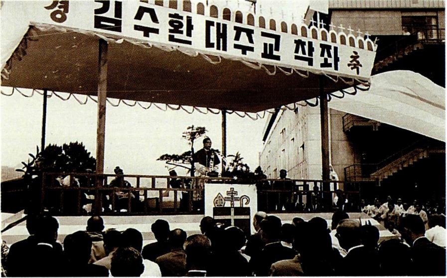 서울대교구장. 추기경. 세례명은 스테파노. 본관은 광 산(光山). 김동한(金東漢, 가롤로) 신부의 아우. 경북 대 구 남산동에서 김영석(金永錫, 요셉)과 서중하(徐仲夏, 마르티나)의 6남 2녀 중 막내로 태어났다. 그의 집안이 천주교와 관련을 맺게 된 것은 조부 때부터인데, 조부인 김보현(金甫鉉, 요한)은 1868년 무진박해(戊辰迫害) 때 충남 논산군 연산(連山)에서 체포되어 서울에서 순교하 였다. 이때 조모인 강말손(姜末孫)도 남편과 함께 체포 되었으나 임신한 몸이었으므로 석방되어 영석을 낳게 되 었으며, 영석은 성장한 뒤 영남 지방으로 이주하여 옹기 장사를 하다가 혼인한 뒤 대구에 정착하였다. 김수환은 이후 부친을 따라 군위(軍威)로 이주, 그곳에서 국민학 교를 다니다가 1933년 대구 성 유스티노 신학교 예비과 를 거쳐 동성상업학교 을조(소신학교)에 입학하였다. 1941년 동성상업학교를 졸업한 후 일본으로 건너가 상 지대학(上智大學) 문학부 철학과에 입학하였으나, 1944 년 학병으로 강제 징집되어 동경 남쪽 후시마(父島)에서 훈련을 받던 중 종전(終戰)을 맞고 상지대학에 복학하였 다. 그리고 1947년, 해방을 맞이한 조국으로 돌아와 성 신대학(가톨릭대학의 전신)에 편입, 4년 후인 1951년 9월 15일 대구에서 서품되었다. 김 신부는 이후 경북 안동 본당의 주임 신부로 사제 생 활의 첫발을 내디딘 이래 1953년 대구교구장 비서, 대 구교구 재경부장, 해성병원 원장, 1955년 경북 김천 본 당 주임 신부, 김천 성의중고등학교 교장, 대구교구 평의 원을 역임하였다. 그리고 1956년 7월에 독일 뮌스터 (Miinster) 대학으로 유학, 동 대학원에서 신학과 사회학 을 공부하고 1964년 귀국하여 가톨릭 시보사 사장으로 임명되었으며, 1966년 2월 15일 마산교구가 설정됨과 동시에 그 초대 교구장으로 임명되어 이해 5월 31일 주 교 성성식과 교구장 착좌식을 가졌다. 이때 김 주교는 초 대 교구장으로서 제2차 바티칸 공의회에서 제시한 교회 쇄신 정신에 따라 사목 행정을 펴나갔고, 한국 주교 회의 부의장과 세계 주교 대의원 회의 한국 부대표 등을 맡아 활동하였다. 그러던 중 1968년 서울대교구장 노기남(盧 基南, 바오로) 대주교가 사임하면서 동년 4월 서울대교 구장에 임명됨과 동시에 대주교로 승품되었고, 이듬해 4 월 28일 교황 바오로 6세에 의해 추기경으로 서임되어 4월 30일 로마에서 '성 펠릭스 성당' 명의의 추기경 서 임식을 가졌다. 김 추기경은 이후 1970년 한국 천주교 주교 회의 의 장과 여러 분과 위원장, 주교 회의 산하 여러 전국 단체 들의 총재를 역임했으며, 1974년 서강대학교에서 명예 문학 박사, 1977년 미국 노트르담 대학에서 명예 법학 박사, 1988년 일본 상지대학에서 명예 신학 박사, 1990 년 고려대학교에서 명예 철학 박사, 미국 시튼 힐(Seaton Hill) 대학에서 명예 법학 박사, 1994년 연세대학교에서 명예 신학 박사 학위를 받았다. 아울러 그 동안 한국 천 주교의 순교자 시성 운동, 해외 선교 사업, 조선교구 설 정 150주년 행사, 한국 천주교회 창설 200주년 행사, 서울 제44차 세계 성체 대회 등을 통해 한국 교회를 국 내외에 드러내는 데 많은 역할을 하였다. 또 서울대교구 장으로서 교구의 발전에 노력하여 1968년 말에 48개 본 당 14만여 명이던 교세를 1993년 말에는 163개 본당 1 백만여 명으로 확대시켰고, 교구의 성직자 양성에 힘쓴 결과 1993년 말 현재 성직자수 629명(한국인 536, 외국 인 93)을 기록하게 되었다. 뿐만 아니라 교구의 각종 사 회 사업을 발전시키는 데도 노력해 왔으며, 현재 서울대 교구 유지 재단 산하에 있는 각 기관과 단체의 이사장 및 총재를 맡고 있다. 한편 김 추기경은 1968년 서울대교구장에 취임하면 서 "교회의 높은 담을 헐고 사회 속에 교회를 심어야 한 다"는 인사말을 통해 제2차 바티칸 공의회의 정신에 따 른 교회 쇄신과 현실 참여의 원칙을 밝혔다. 동시에 가난 하면서도 봉사하는 교회, 한국의 역사 현실에 동참하는 교회상을 제시하여 교회 안팎의 젊은 지식인, 노동자들 로부터 전폭적인 지지를 얻었고, 이후 정치 현실과 노동 문제에 대한 강경 발언을 서슴지 않음으로써 대내외적으 로 인권 옹호자라는 명성을 얻기도 하였다. 그의 사회 교 리는 인간의 존엄성에 대한 확고한 신념을 바탕으로 하 는 공동선(共同善)의 추구에 목적을 두고 있는데, 그는 이러한 교리를 통해 모든 사회 구조나 정치 형태는 공동 선을 추구함에 있어 평등한 권익을 보장하고 특권 의식 과 배금주의를 버리며, 혁신과 정화의 근본이 되는 인간 내면의 회심을 주도해야 한다고 주장하였다. 또 이러한 공동선의 추구를 위한 실천 과정에서 교회는 불의와의 타협을 거부해야 한다고 역설하였다. 이와 같은 김 추기 경의 사회 교리에 대한 의식으로 한국 천주교회는 제3 공화국 이래 현재까지 정치 권력에 의해 많은 고난과 희 생을 받아 왔지만, 그 희생과 고난의 대가로 교회의 지위 가 대내외적으로 크게 격상되었고, 2000년대 복음화를 위한 발판도 다지게 되었다. (→ 서울대교구 ; 한국 천주 교회) ※ 참고문헌 《가톨릭 사전》 <가톨릭 신문>/ 구중서, 《대화집 : 김 수환 추기경》, 지식산업사, 1981/ 오효진, 《金壽煥