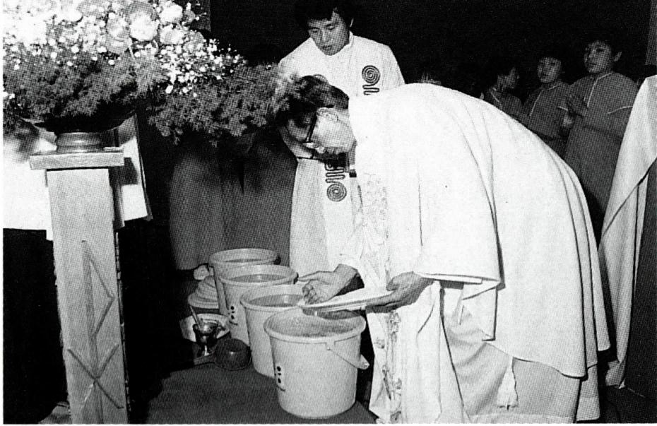 세례성사 때 물로 씻는 예식에 사용되는 축복된 물. 세 례 수여 때 사용되는 물은 부득이한 경우 외에는 전례서 의 규정대로 축복되어야 한다(교회법 853조). 세례성사에 사용되는 물은 성사의 참된 표지가 되기 위해서나 보건 상의 이유로 깨끗한 자연수 즉 수돗물 · 샘물 · 우물물 · 냇물 · 강물 · 바닷물 · 빗물 · 눈 녹은 물 · 얼음 녹은 물 · 이