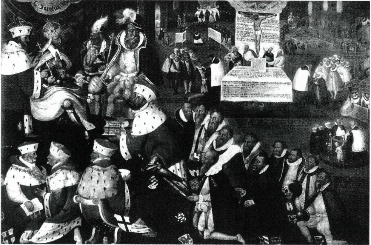 아우크스부르크에서 개최된 제국 의회에서 루터 지지자들이 자신들의 견해와 입장을 밝히기 위해 신성 로마 제국의 황제 카알 5세(1519~1556)에게 독일어와 라틴어로 작성하여 1530년 6월 25일 제출한 신조. 7명의 제후들과 2명의 자유 도시 대표들이 서명하였다. [역사적 배경] 1525년 7월 19일 독일 중부와 북부의 가톨릭 제후들은 농민 전쟁(Ba