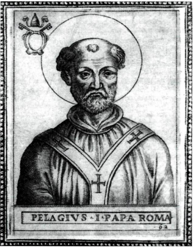 ① 펠라지오 1세(?~561) : 교황(556~561). 〔생 애〕 6세기의 교회사에서 매우 중요한 역할을 한 교황 펠라지오 1세는 이탈리아 로마의 공직자 집안에서 태어났다. 그의 초기 생애에 대해서는 알려진 바가 없다. 그가 부제였던 시기에 동로마 제국의 황제인 유스티니아누스(527~565)가 이탈리아 내 동고트인들의 섭정이었던 아말라순타(Amalasun