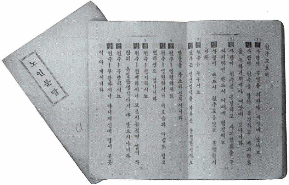 노인들을 위한 교리 문답서. 1934년 서울 성서 활판 소에서 크기 12.4×18.5cm, 분량 44쪽으로 간행되었 다. 편집 겸 발행인은 라리보(Larribeau, 元亨根) 주교. 11 개의 주요 기도문과 76개 조목의 교리 문답이 수록되어 있는데, 그 문답 내용은 같은 해에 간행된 《천주교 요리 문답》에서 발췌한 것으로 어느 부분에서 발췌하였는가는 표로