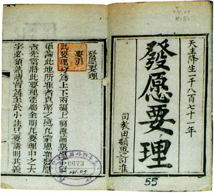 서원(誓願) 즉 성원(聖愿)에 대해 문답식으로 설명한 한역 교리서. 프랑스 출신의 라자리스트인 드라플라스(Delaplace Louis Gabriel, 1820~1884) 주교가 1871년에 저술하여 11.1×18.3cm 크기의 목판본으로 간행하였다. 드라플라스 주교의 한자 성명은 전류사(田類思) 또는 전가벽(全嘉壁)으로, 1846년 마카오에 도착하여 185